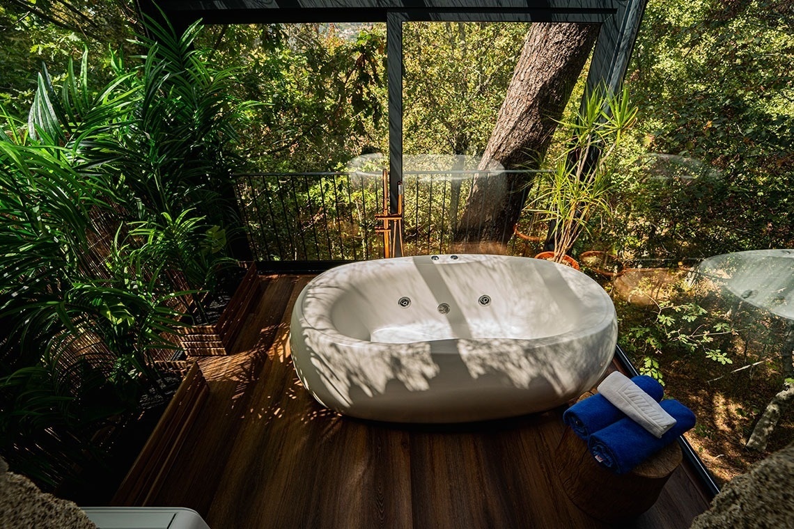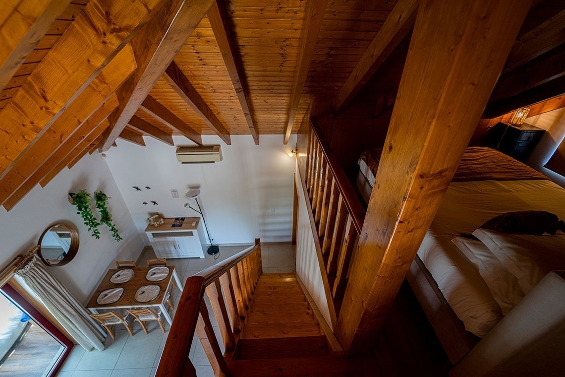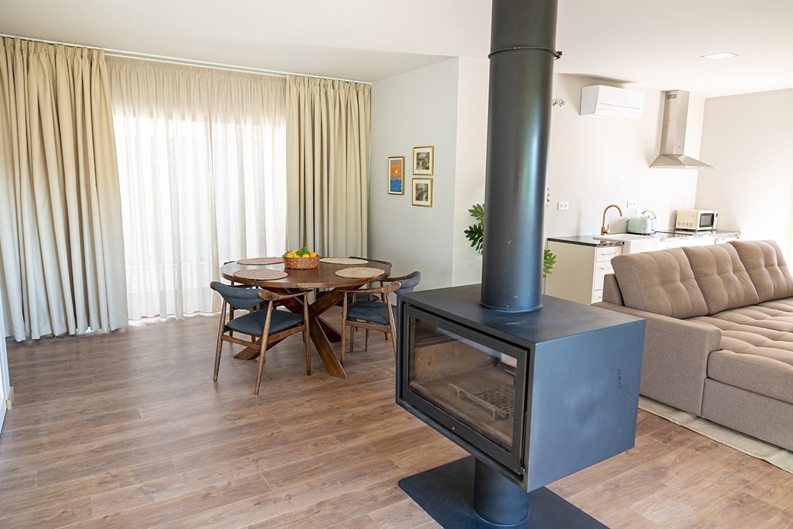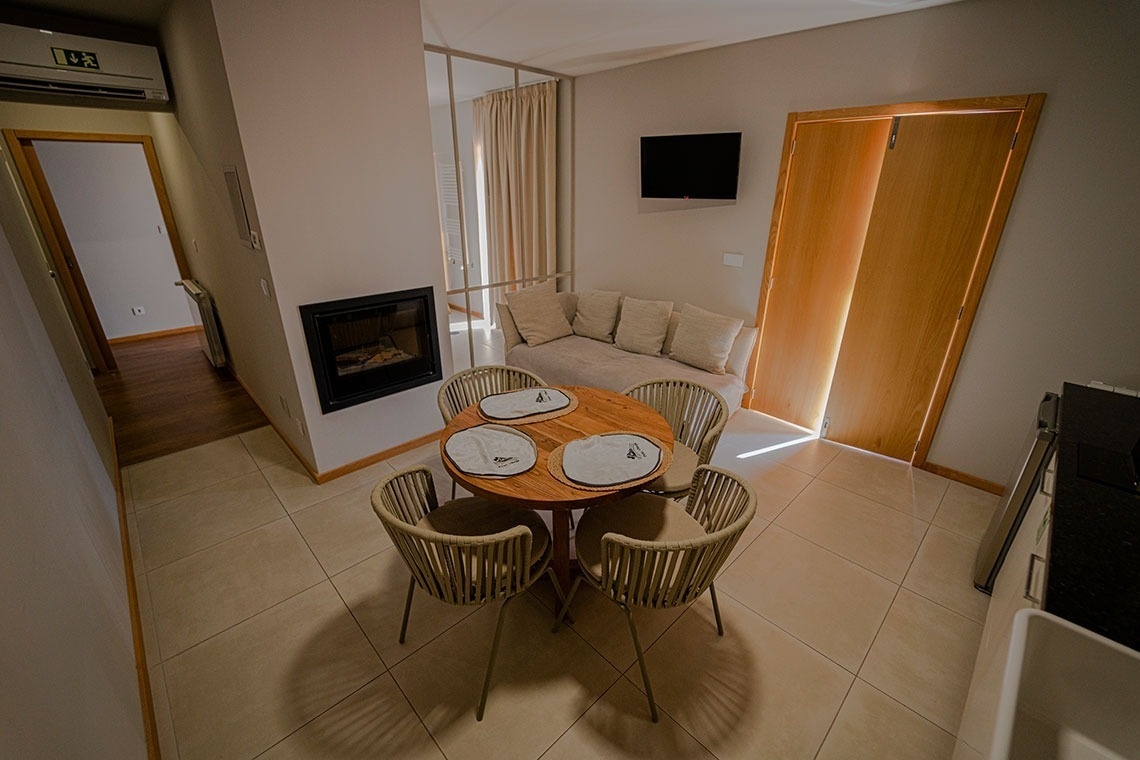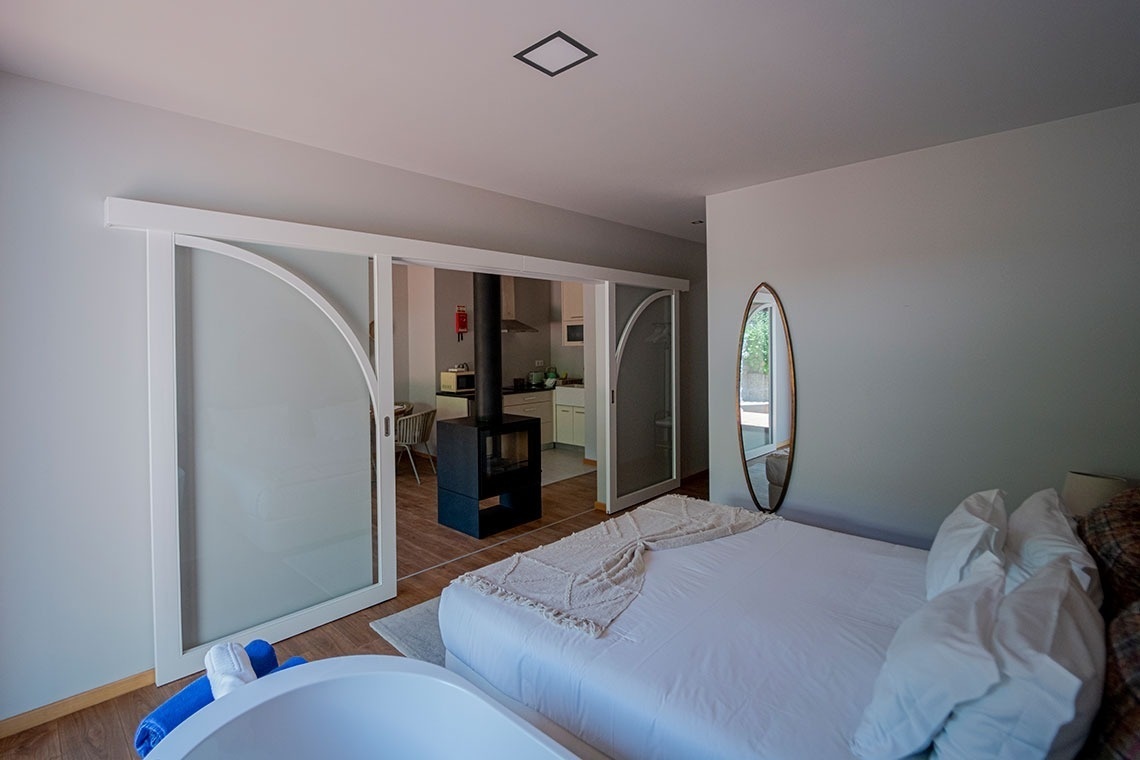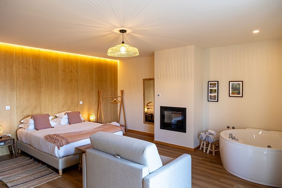 Com uma dimensão de 63m², dispõe de banheira de hidromassagem, cama de casal, kitchenette, sala de estar, TV LCD, ar condicionado, lareira, casa-de-banho com duche e varanda.